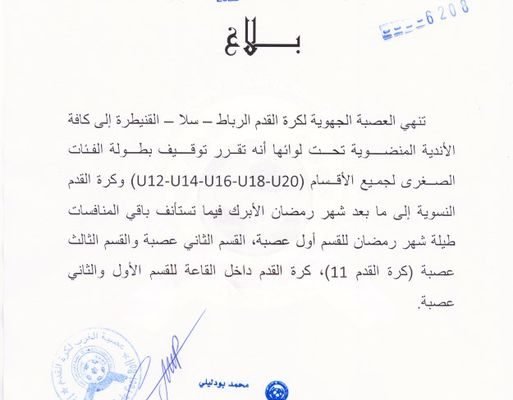 أصدرت عصبةالغرب ،التابعة للجامعة الملكية المغربية لكرة القدم، بلاغا إلى الأندية المنضوية تحت لوائها، أوضحت فيه أنه تقرر توقيف بطولة الفئات الصغرى لجميع الأقسام (انظر البلاغ المرفق)، وكرة القدم النسوية، إلى ما بعد شهر رمضان، بينما تُستأنف باقي المنافسات طيلة شهر رمضان للقسم أول عصبة، القسم الثاني والثالث عصبة (كرة القدم 11)، كرة القدم داخل…